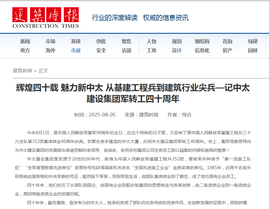 | 建筑時(shí)報(bào)8月5日報(bào)道了輝煌四十載 魅力新中太 從基建工程兵到建筑行業(yè)尖兵——記中太建設(shè)集團(tuán)軍轉(zhuǎn)工四十周年 |